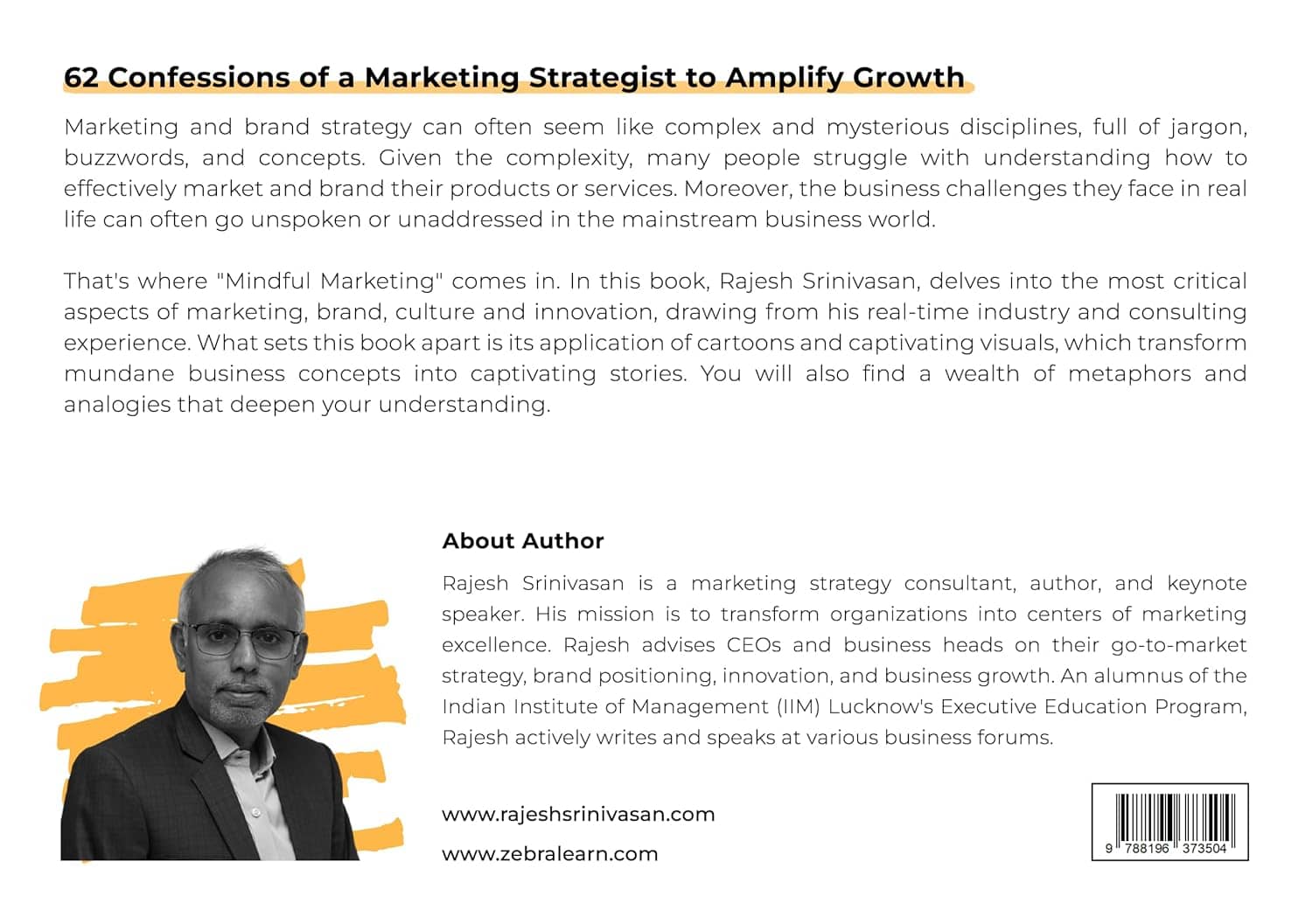 The First-of-its kind Cartoon Book to Master Modern Marketing Marketing and brand strategy can often seem like complex and mysterious disciplines, full of jargon, buzzwords, and concepts. Given the complexity, many people struggle with understanding how to effectively market and brand their products or services. Moreover, the business challenges they face in real life can often go unspoken or unaddressed in the mainstream business world. That’s where “Mindful Marketing” comes in. In this book, Rajesh Srinivasan, delves into the most critical aspects of marketing, brand, culture and innovation, drawing from his real-time industry and consulting experience. What sets this book apart is its application of cartoons and captivating visuals, which transform mundane business concepts into captivating stories. You will also find a wealth of metaphors and analogies that deepen your understanding.2